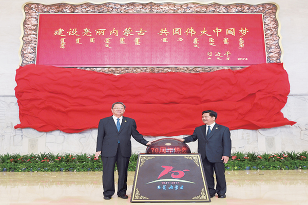 87上午,中共中央政治局常委、全国政协主席、中央代表团团长俞正声率中央代表团出席向内蒙古自治区赠送纪念品仪式。中央代表团向内蒙古赠送了习近平总书记题词贺匾、题词座屏等纪念品。
